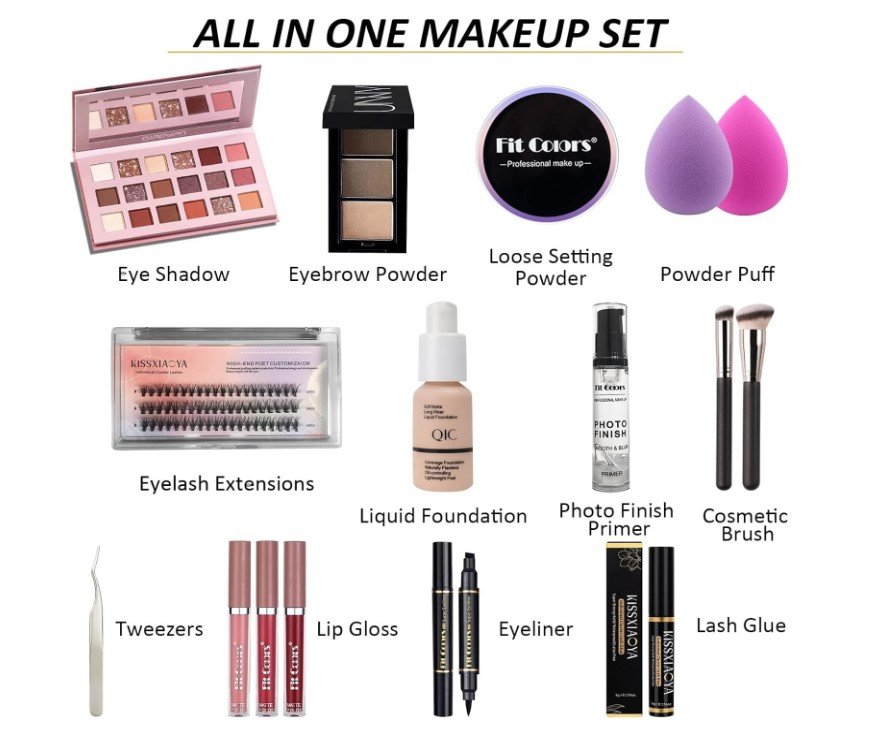 All In One Makeup Essential Starter Kit for Beginners or Pros, 18 Colors Naked Eyeshadow Palette Nude Face Primer, Brush, Sponge, Eyebrow Powder, Winged Eyeliner Stamp